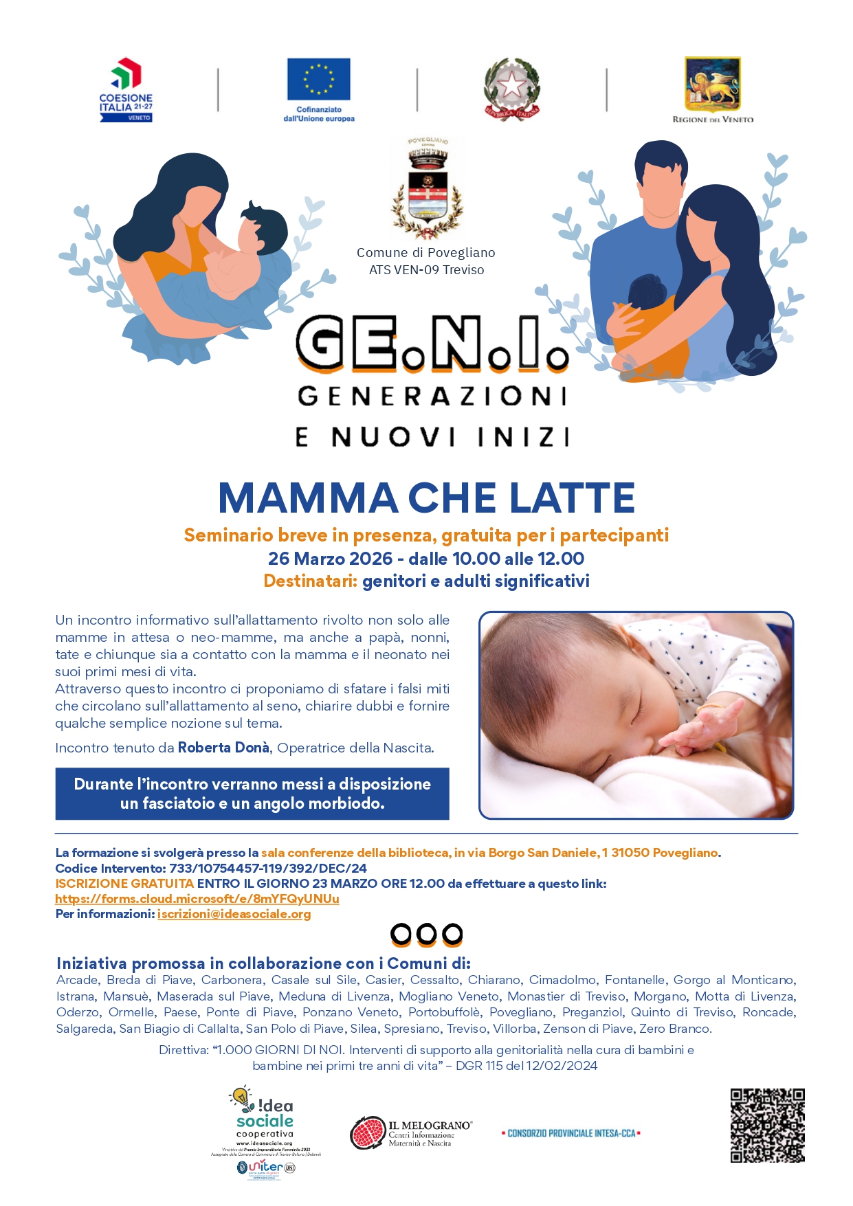 Il Progetto GE.N.I. rientra nella direttiva regionale “1.000 giorni di noi – Interventi di supporto alla genitorialità nella cura di bambini e bambine nei primi tre anni di vita” (DGR n. 115 del 12/02/2024) ed è promosso dai 37 Comuni dell'Ambito Territoriale Sociale VEN09 di cui è partner anche il Comune di Povegliano.
