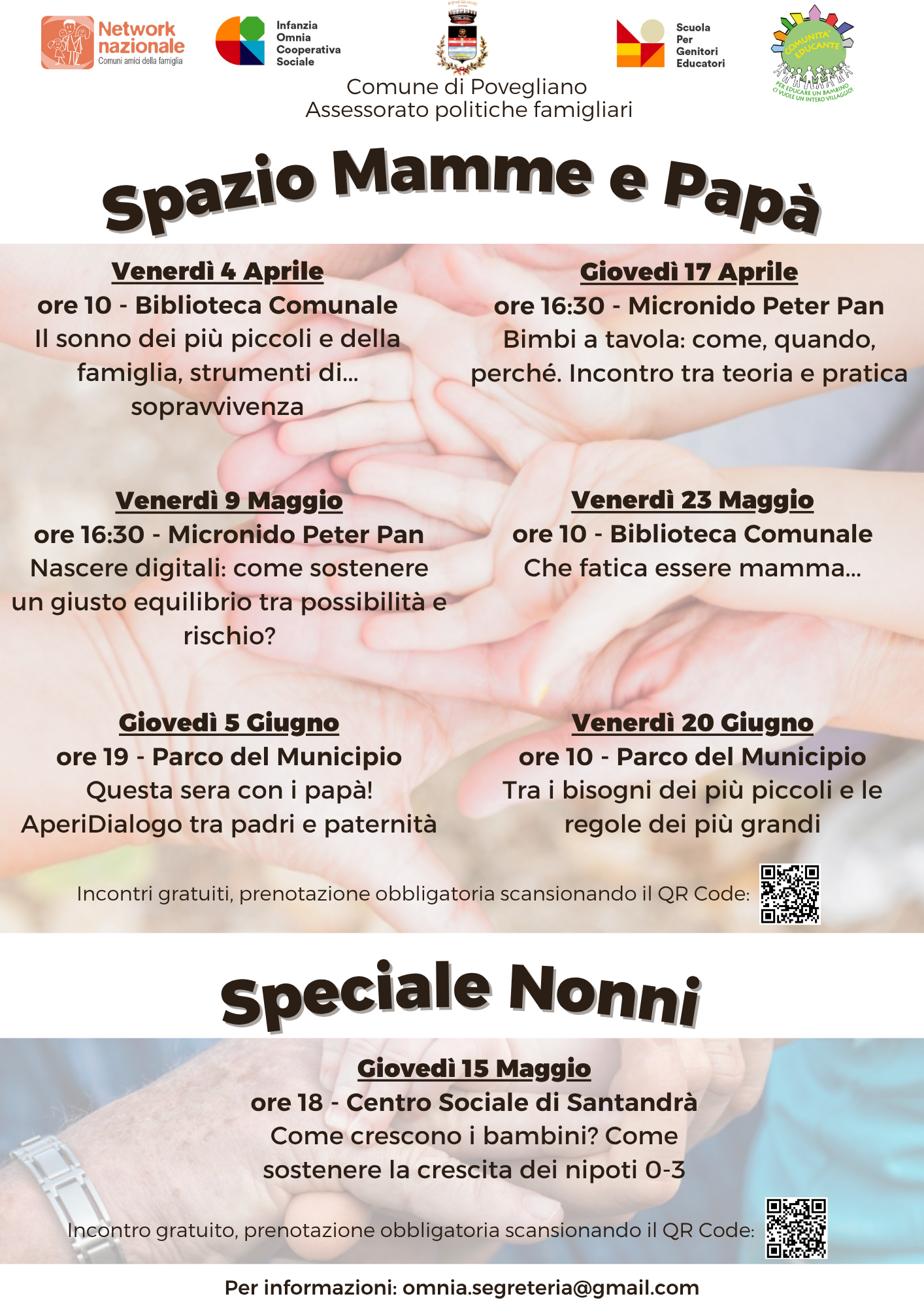 La Cooperativa Sociale Omnia e il Comune di Povegliano organizzano un ciclo di incontri dedicati alle varie esigenze di mamme, papà e nonni. Gli incontri saranno condotti da una Educatrice Pre neonatale e d'infanzia e da una Psicologa perinatale.