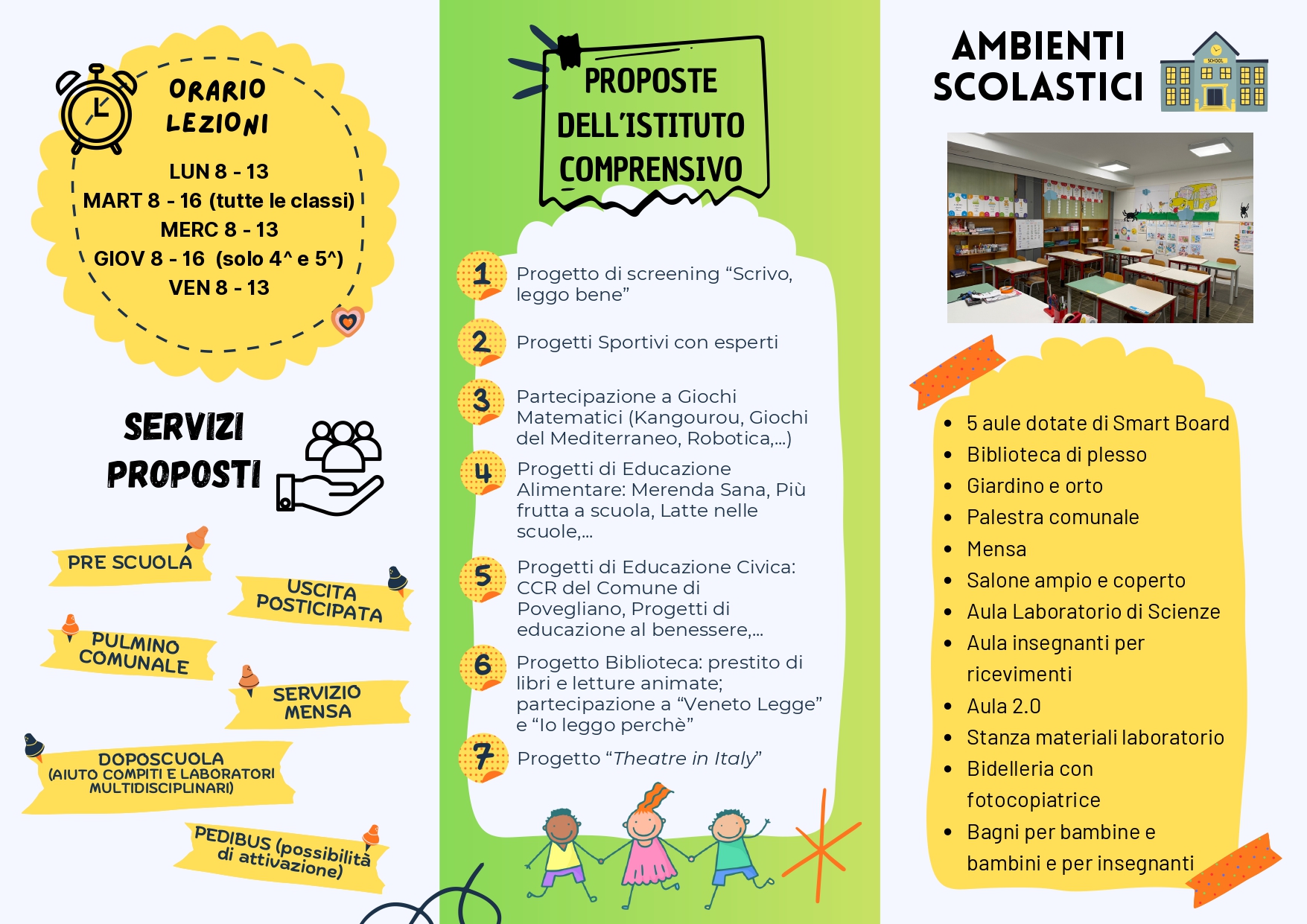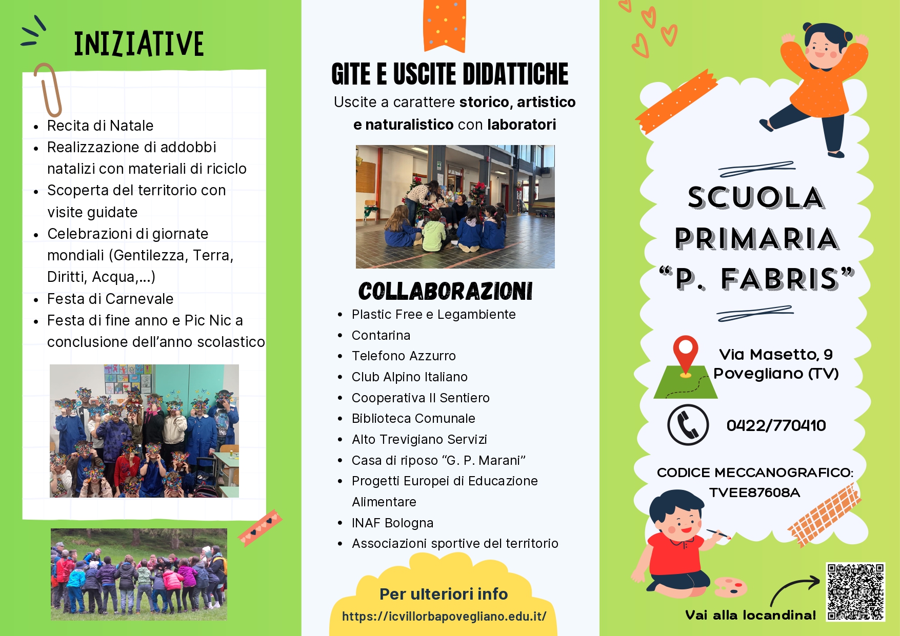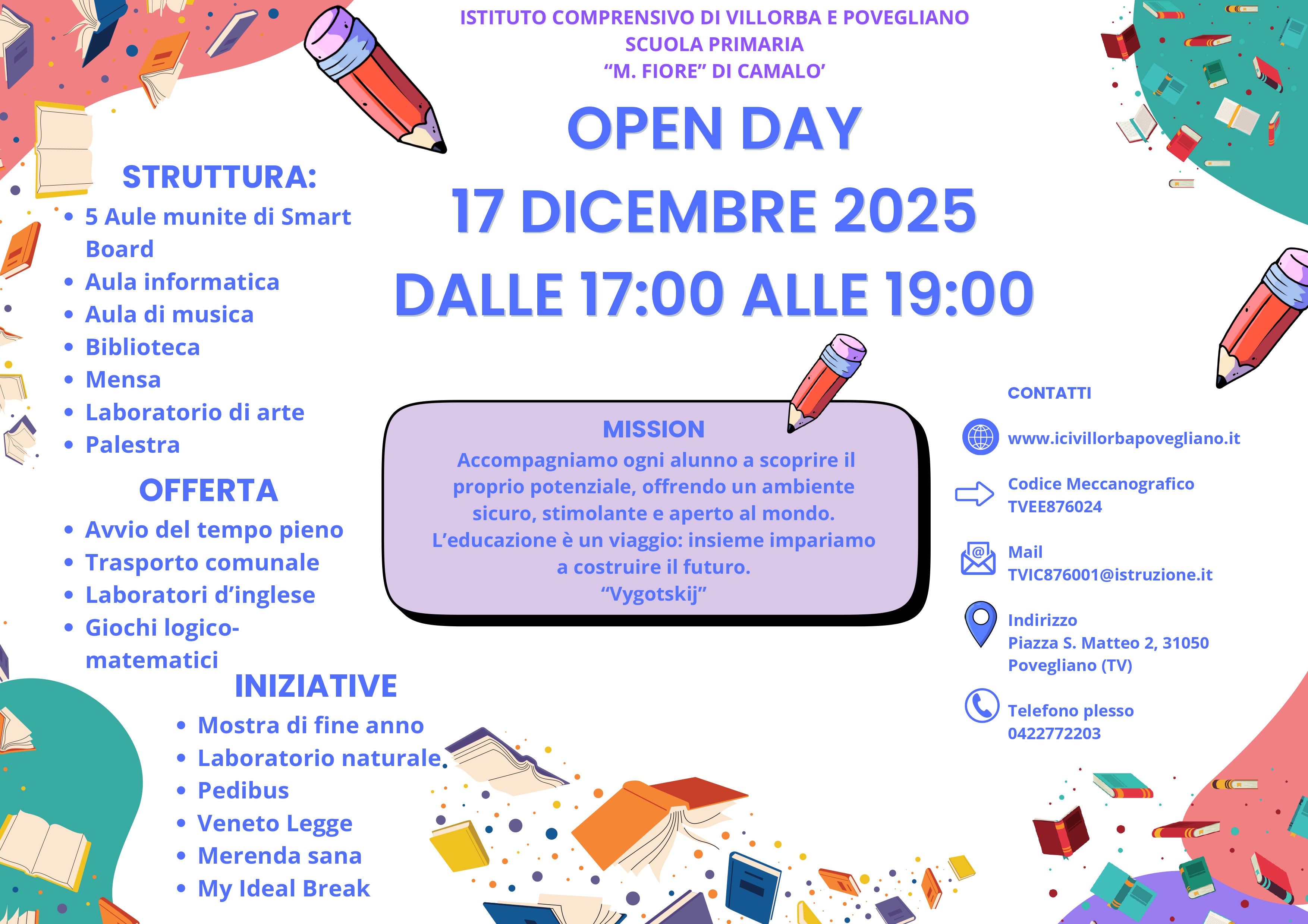 L'Open-Day si terrà mercoledì 17 dicembre 2025 dalle 15:30 alle 17:30 presso la Scuola Primaria "Placido Fabris" di Povegliano (Via Masetto, 9).